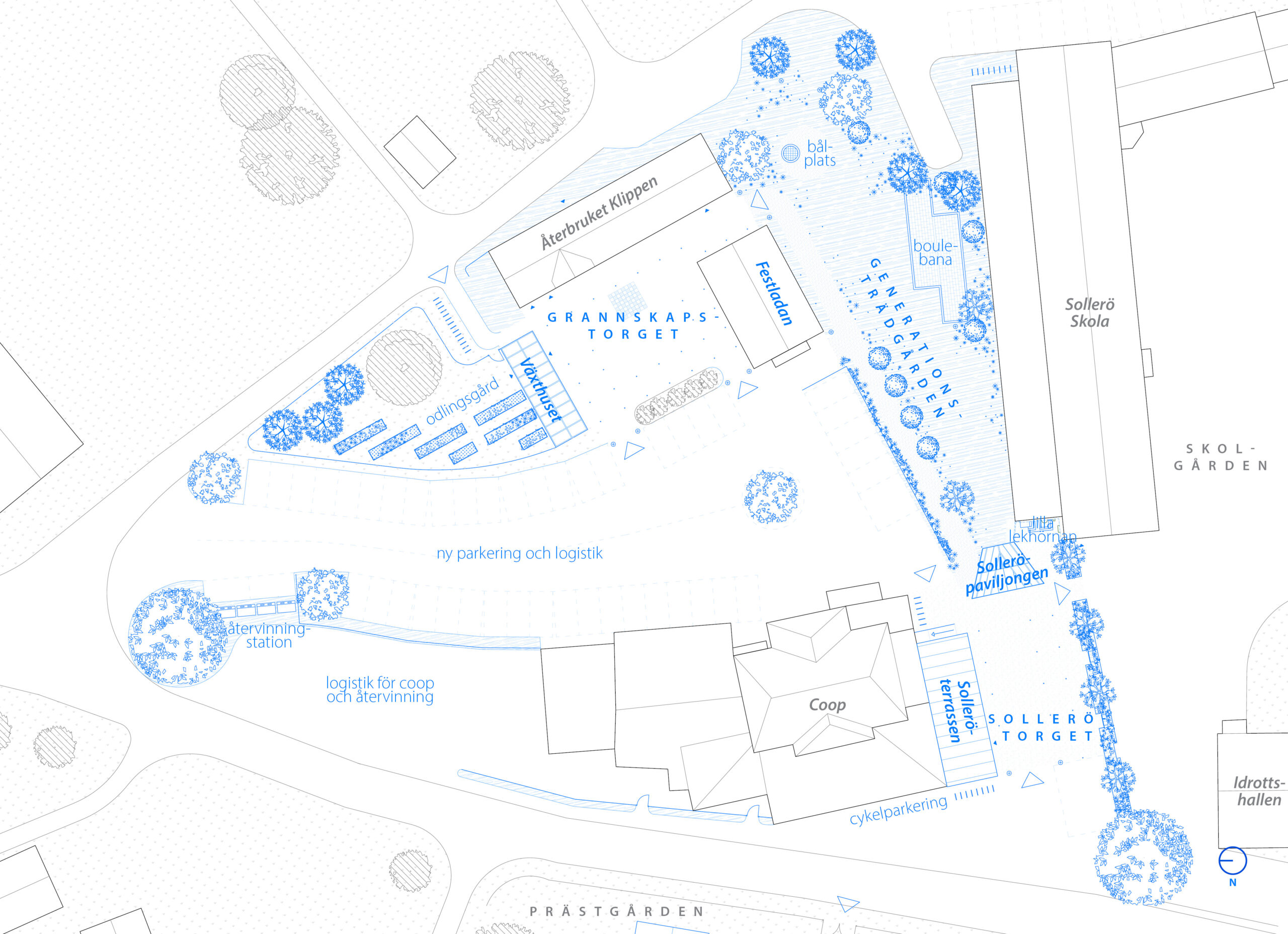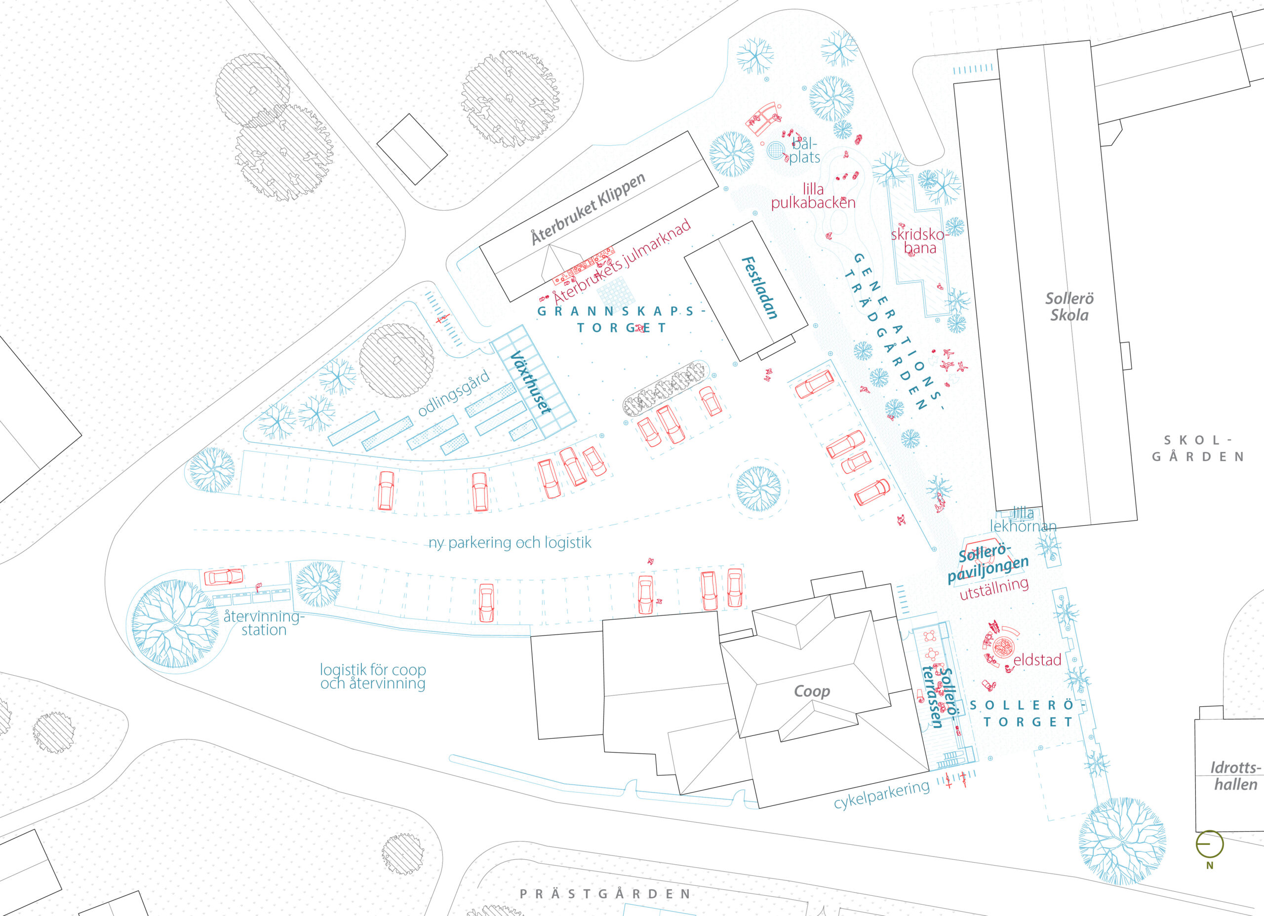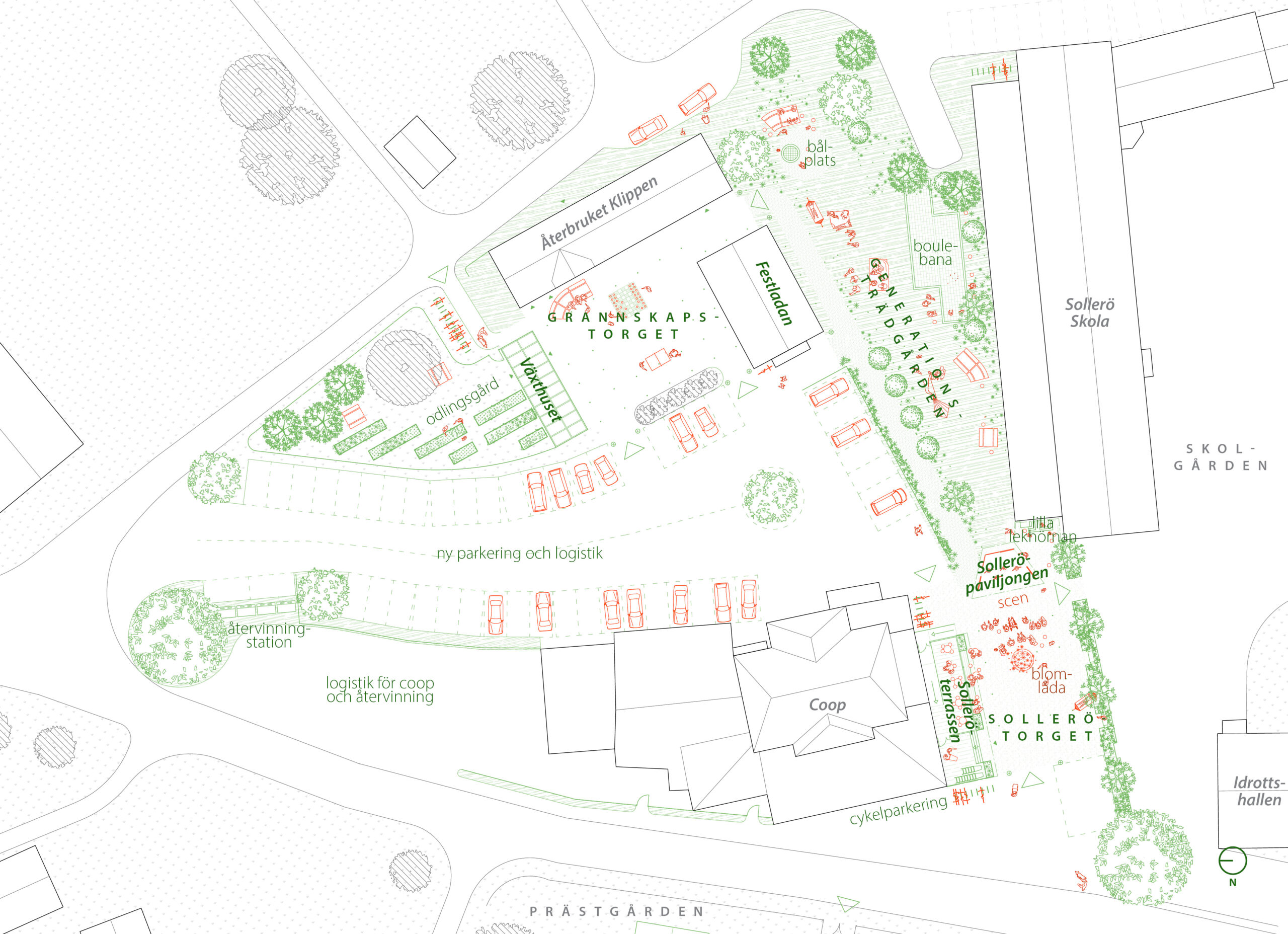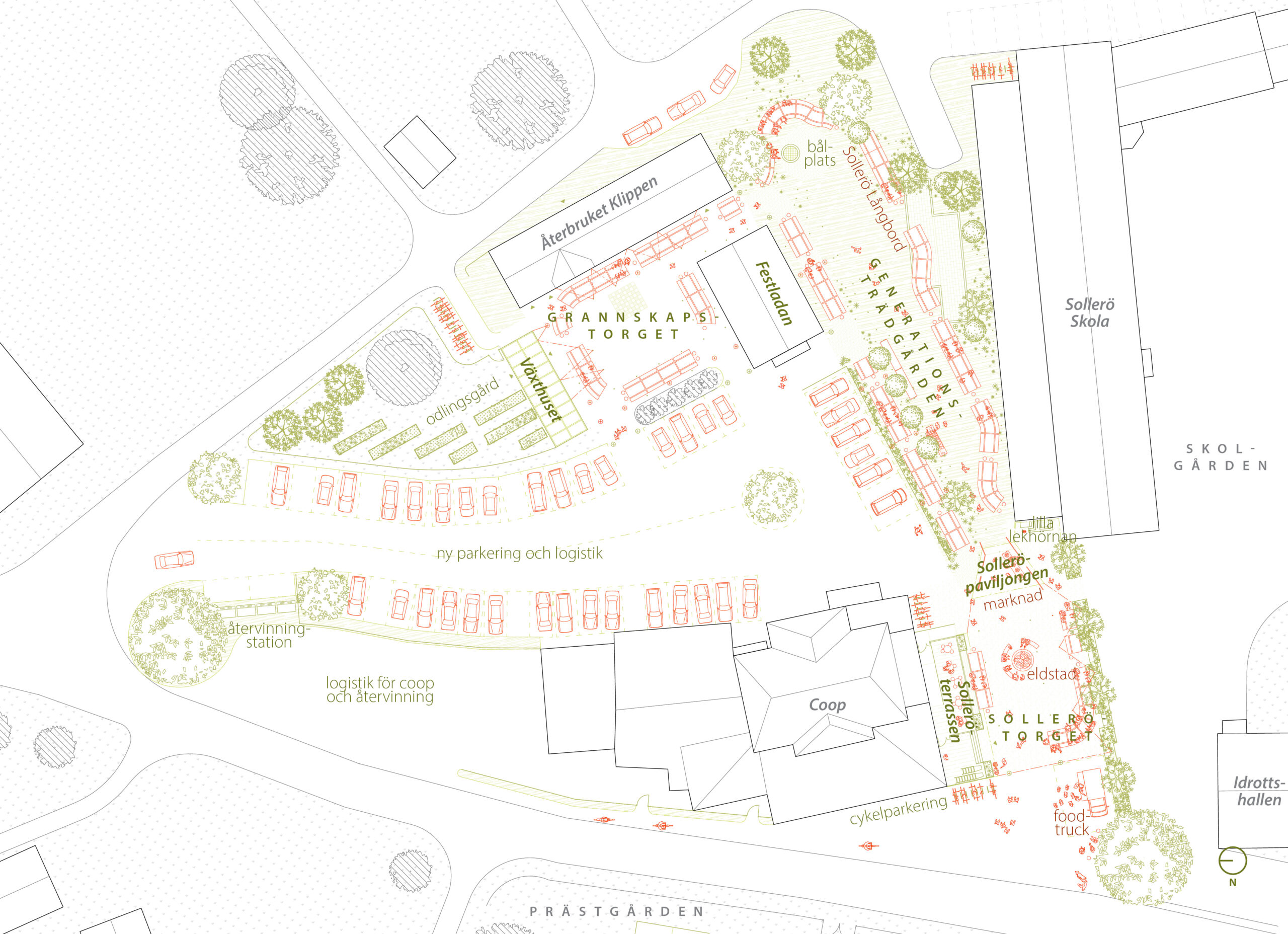 Entren till den lokala affären och entren till skolan skapar byns största flöden. Den valda platsen har framkommit genom analyser i tidigare projekt som den rumslighet med störst potential att bli ett samlande torg. Under testfasen bekräftas att denna plats skulle nå flest och störst blandning av människor; boende och besökare. Redan med en tillfällig och mycket enkel gestaltning iakttar vi hur det uppstår nya möten, utbyten och idéskapande.
